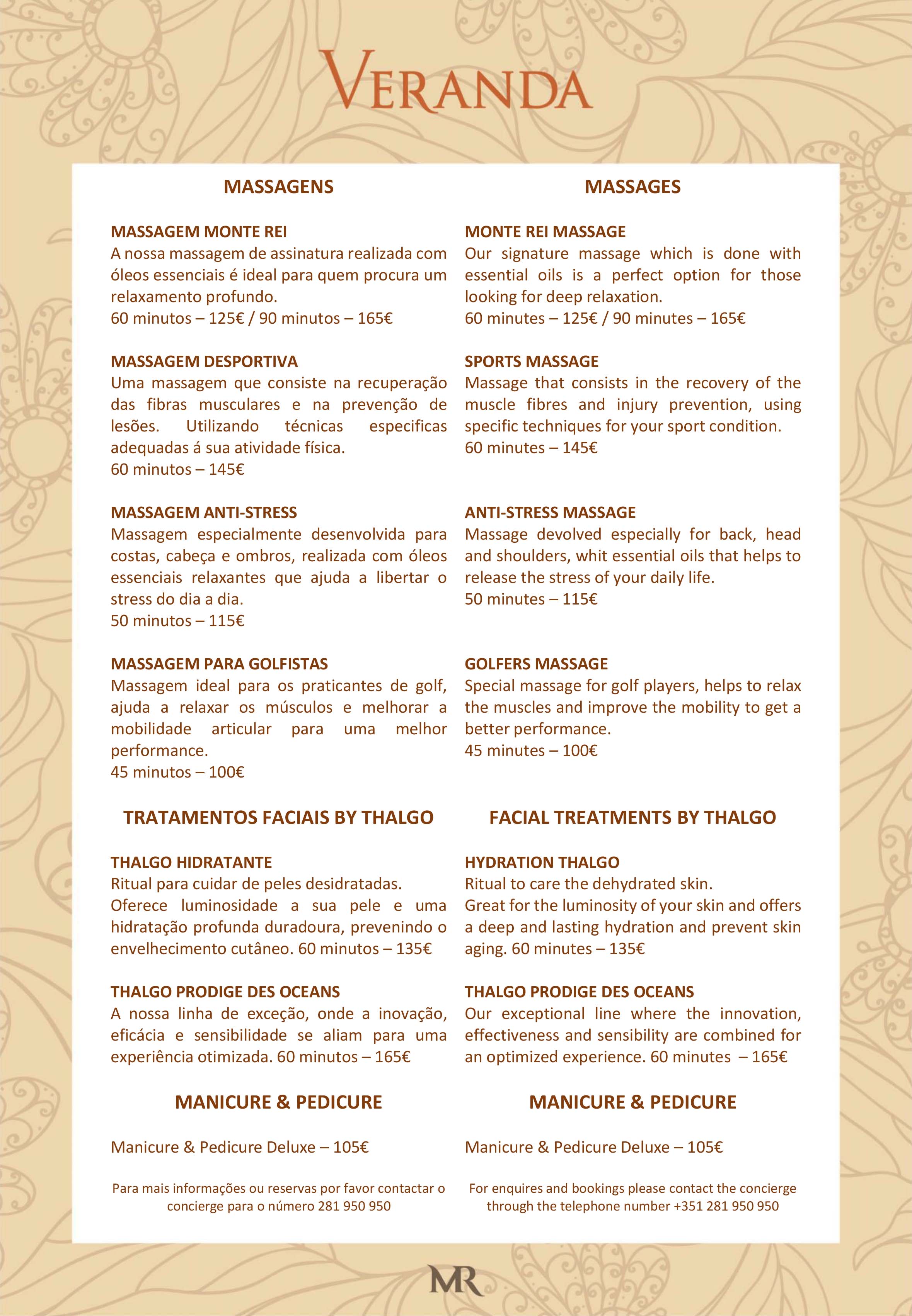 To request massages and beauty treatments please contact the Resort Reception through the Ext. 7200 or phone number +351 281 950 950.